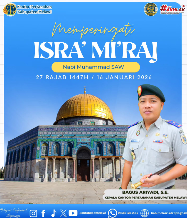 “Segenap keluarga besar Kantor Pertanahan Kabupaten Melawi mengucapkan Selamat Memperingati Isra’ Mi’raj Nabi Muhammad ﷺ. Semoga momentum ini menjadi pengingat bagi kita semua untuk terus meneladani akhlak dan perjuangan Rasulullah SAW,” ujar Bagus Ariyadi, Jumat (16/1/2026).