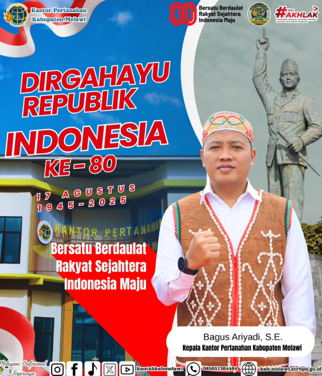 Wartamelawi.com – Dalam semangat kebersamaan memperingati Hari Ulang Tahun (HUT) ke-80 Kemerdekaan Republik Indonesia, Keluarga Besar Kantor Pertanahan Kabupaten Melawi menyampaikan ucapan selamat Dirgahayu Republik Indonesia.