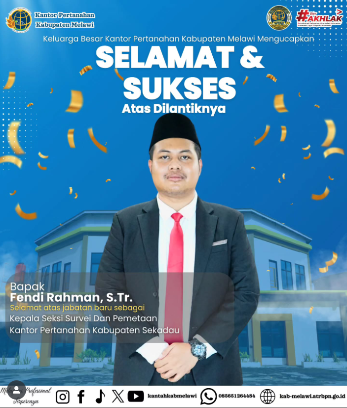 “Atas nama keluarga besar Kantor Pertanahan Kabupaten Melawi, kami mengucapkan selamat dan sukses kepada Bapak Fendi Rahman, S.Tr. atas pelantikannya sebagai Kepala Seksi Survei dan Pemetaan Kantor Pertanahan Kabupaten Sekadau. Semoga jabatan ini menjadi amanah yang membawa berkah serta semakin memperkuat kontribusi di bidang pertanahan,” ujar Bagus Ariyadi, SE. Kamis (09/10/25).