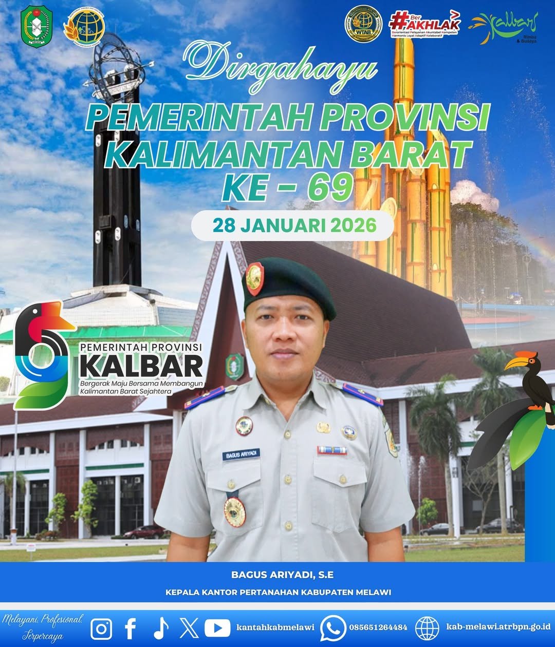 Wartamelawi.com – Kepala Kantor Pertanahan Kabupaten Melawi beserta seluruh jajaran menyampaikan ucapan Selamat Hari Ulang Tahun ke-69 kepada Pemerintah Provinsi Kalimantan Barat. Peringatan HUT ke-69 ini menjadi momentum penting untuk memperkuat semangat kebersamaan dan persaudaraan dalam membangun daerah.