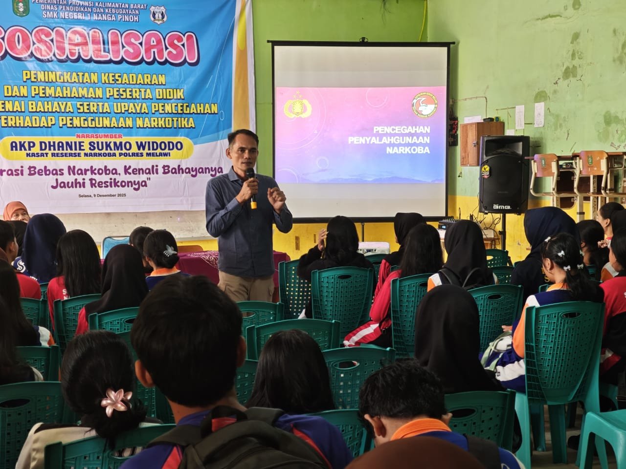 Wartamelawi.com – Kegiatan sosialisasi bahaya narkoba kembali digencarkan Polres Melawi. Selasa (9/12), Kasat Narkoba Polres Melawi AKP Dhanie Sukmo Widodo mendatangi SMKN 1 Nanga Pinoh, Kabupaten Melawi, untuk memberikan penyuluhan mengenai pencegahan penyalahgunaan narkotika di kalangan pelajar.