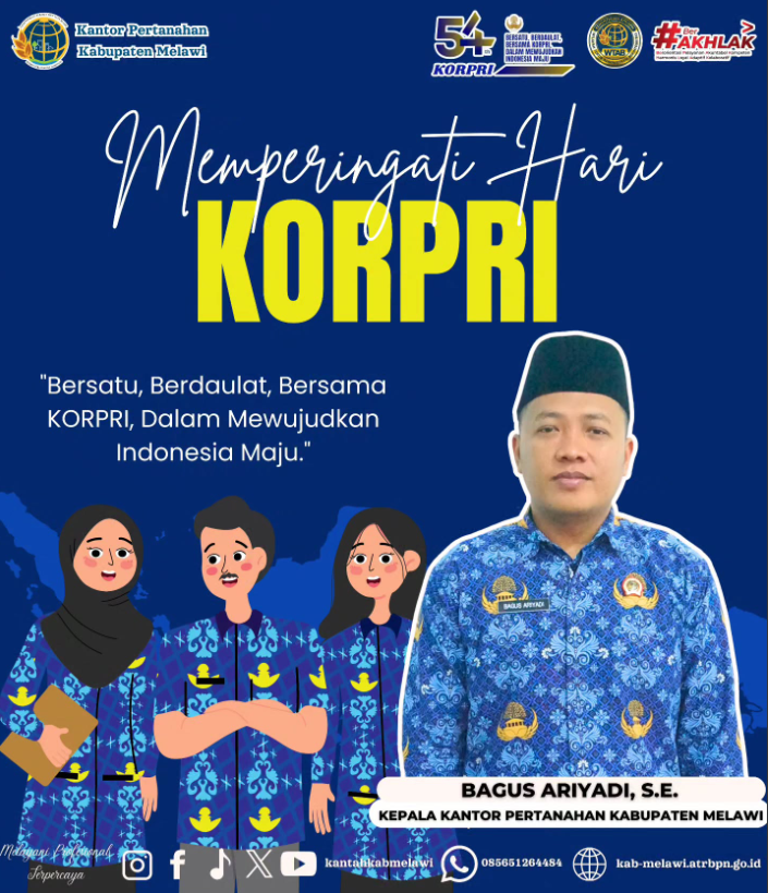Kepala Kantor Pertanahan Kabupaten Melawi, Bagus Ariyadi, S.E., menyampaikan “Selamat Hari Ulang Tahun ke-54 KORPRI. Semoga momentum ini menjadi pengingat dan motivasi bagi seluruh pegawai untuk terus meningkatkan profesionalisme, integritas, dan kualitas pelayanan kepada masyarakat. Mari bersama-sama mengabdi sepenuh hati demi bangsa dan negara.” Ucapnya.