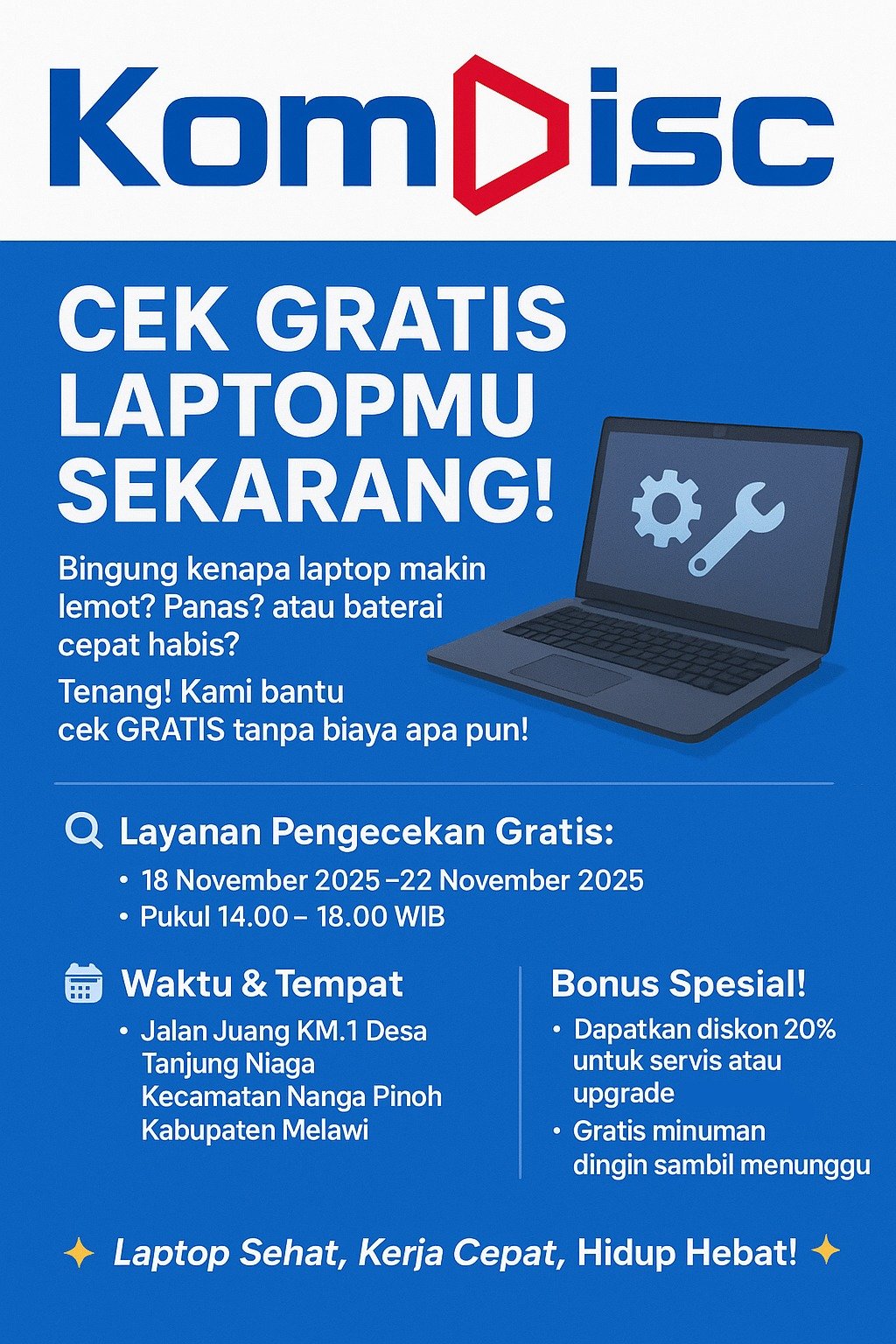 Wartamelawi.com – PT. Komdisc Sukses Teknologi (Komdisc) kembali menunjukkan komitmennya dalam mendukung produktivitas masyarakat di Kabupaten Melawi dengan meluncurkan program “Cek Gratis Laptopmu Sekarang!”. Program ini menawarkan layanan pemeriksaan kesehatan laptop secara gratis, tanpa dipungut biaya, bagi seluruh warga Nanga Pinoh dan sekitarnya.