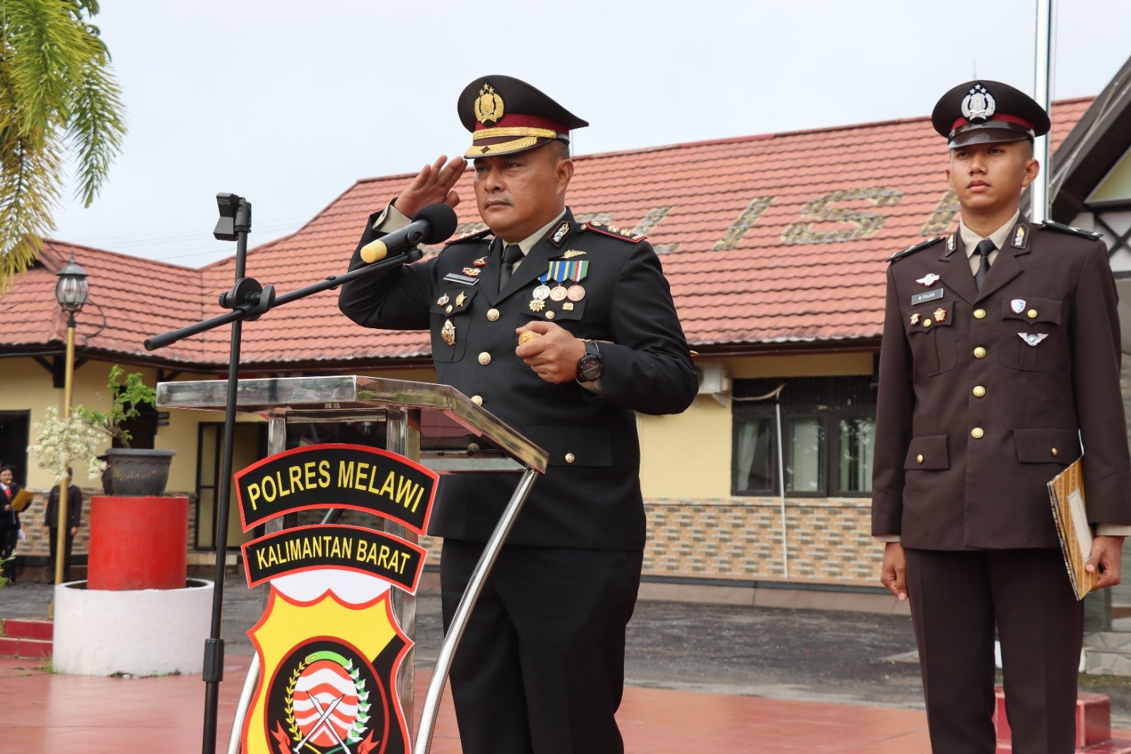 Upacara berlangsung khidmat dan penuh semangat, dipimpin langsung oleh Kapolres Melawi AKBP Harris Batara Simbolon, S.I.K., S.H., M.Tr.Opsla. selaku Inspektur Upacara.