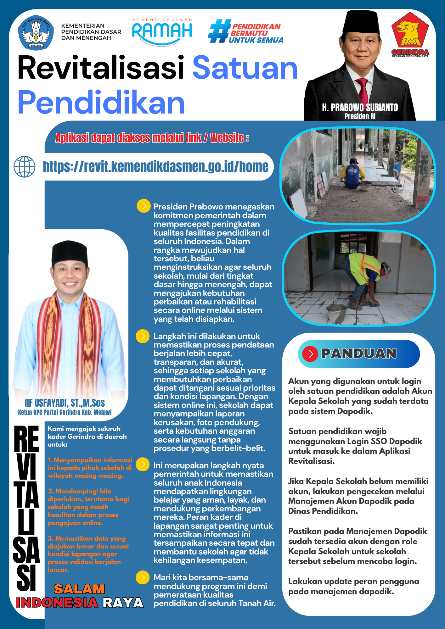 “Presiden Prabowo telah menegaskan komitmen pemerintah dalam mempercepat peningkatan fasilitas pendidikan. Sekolah kini dapat mengajukan perbaikan atau rehabilitasi secara online melalui sistem resmi pemerintah. Kami mengajak seluruh kader Gerindra untuk menyampaikan informasi ini kepada sekolah di wilayah masing-masing, mendampingi bila diperlukan, serta memastikan data yang diajukan benar dan sesuai kondisi lapangan,” ujarnya.