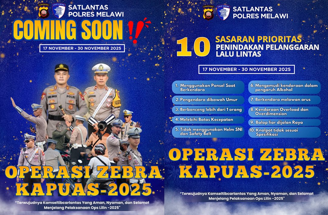 Wartamelawi.com – Satuan Lalu Lintas (Satlantas) Polres Melawi resmi menggelar Operasi Zebra Kapuas-2025 mulai 17 hingga 30 November 2025. Operasi ini digelar sebagai langkah penertiban dan penindakan pelanggaran lalu lintas (Garlantas) guna mewujudkan Keamanan, Keselamatan, Ketertiban, dan Kelancaran Lalu Lintas (Kamseltibcarlantas) yang aman dan kondusif, terutama menjelang pelaksanaan Operasi Lilin 2025.
