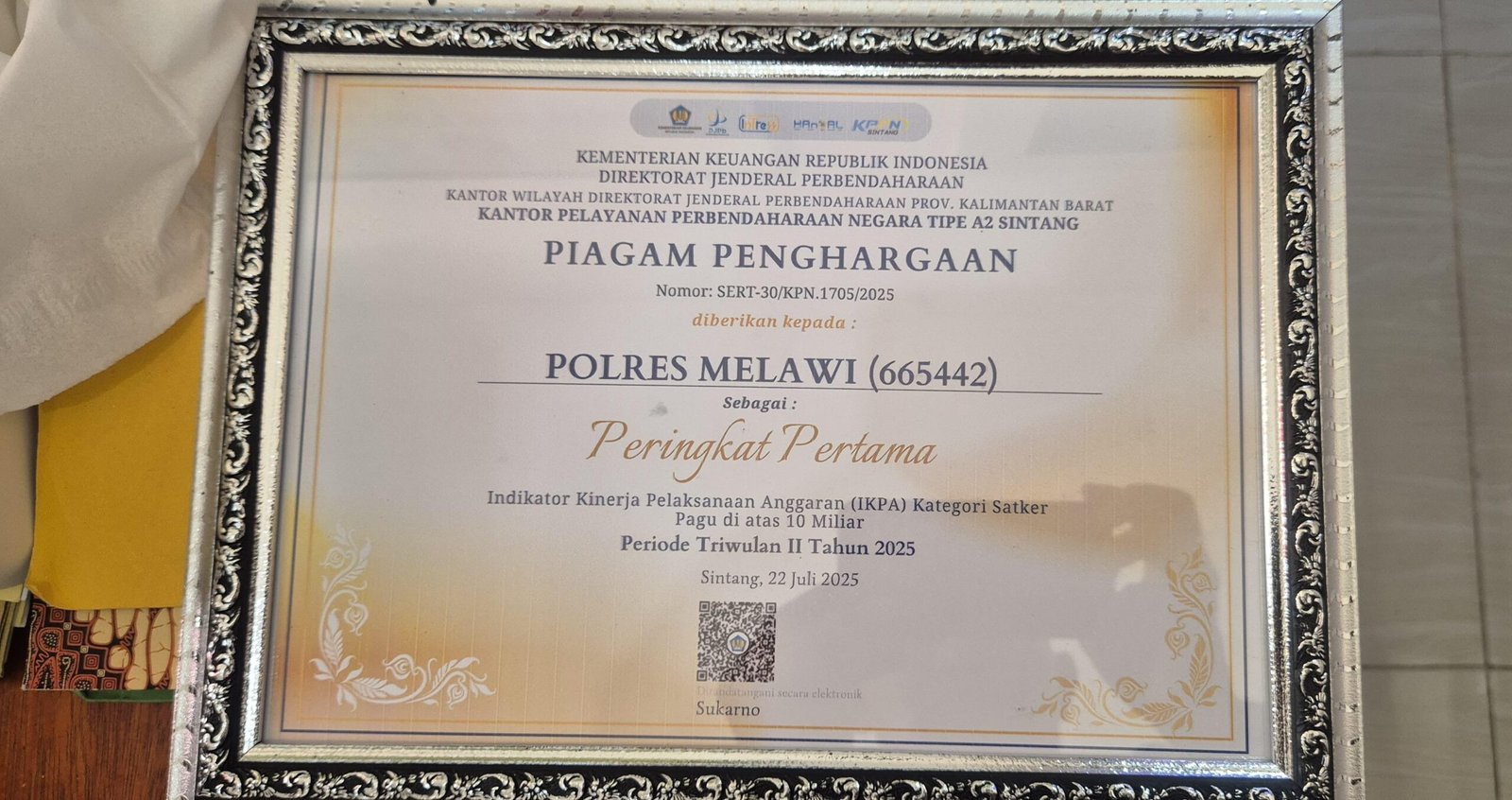 Wartamelawi.com – Polres Melawi kembali menorehkan prestasi membanggakan dengan meraih penghargaan sebagai Satuan Kerja Berkinerja Terbaik dalam Indikator Kinerja Pelaksanaan Anggaran (IKPA) dari Kantor Pelayanan Perbendaharaan Negara (KPPN) Tipe A2 Sintang untuk periode Triwulan II Tahun 2025.