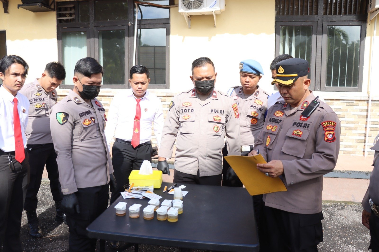 Dalam pelaksanaannya, personel yang terdiri dari perwira hingga bintara menjalani tes secara bergantian dengan pengawasan ketat dari tim Propam.