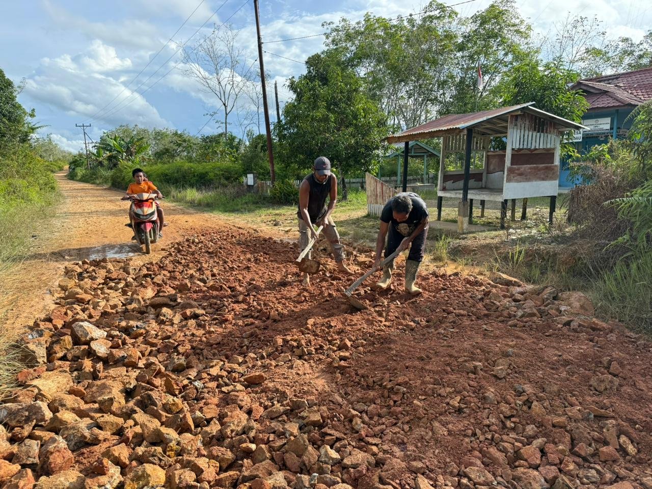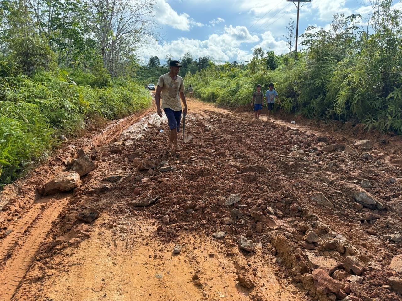 Informasi yang didapat, sejumlah warga tampak bergotong royong menimbun ruas jalan yang mengalami kerusakan cukup parah menggunakan material laterit. Sebanyak 10 dam material laterit didatangkan dari Nanga Pinoh dan digunakan untuk menutup lubang-lubang jalan serta meratakan permukaan yang sebelumnya berlumpur dan sulit dilalui kendaraan.